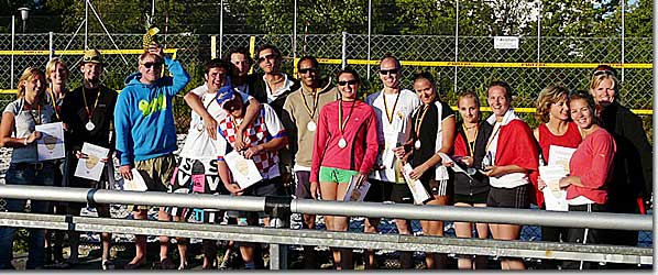 Nun konnten alle ganz entspannt auf das Finale warten. Es wurde heiß diskutiert, wem nun die Favoritenrolle zustünde, doch man kam zu keinem Entschluss und somit war klar, dass es dieses Finale in sich haben würde. Nach relativ deutlichem ersten Satz hatte Niederbayern die Nase vorn und Anna/Diana schienen die sicheren Siegerinnen zu sein. Aber Fehlanzeige: durch das ständige Anpeitschen der kanadischen Misi kamen sowohl ihre Partnerin Lucie als auch sie selbst ins Spiel zurück und kämpften ihre Kontrahenten in einem mega spannenden Dreisatzmatch doch noch nieder. Der Sieg ging somit zurecht an Lucie/Misi aus Kanada vor dem Niederbayerischen Duo Anna/Diana. Herzlichen Glückwunsch! |